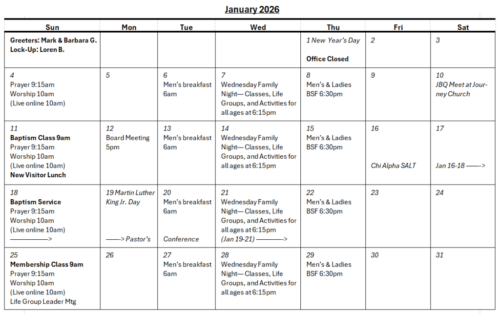 Wednesday December 24th & Wednesday December 31st – Merry Christmas and Happy New Year – there will be NO Wednesday Family Night these weeks. We will resume on Wednesday January 7th at 6:15pm.